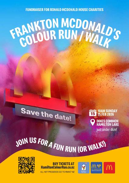 The Frankton McDonald’s Colour Run/Walk is set to bring a burst of energy, colour, and community spirit to Innes Common at Hamilton Lake on Sunday, 15 February 2026, from 10 am.